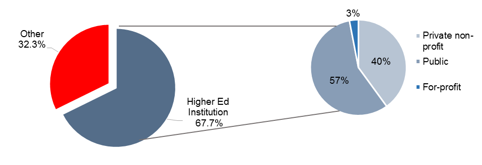 The majority of respondents are primarily affiliated with an institution of higher education (68%). Of those, most respondents are affiliated with public institutions: 35 percent are affiliated with public four-year universities and colleges, 12 percent with community colleges, and 9 percent with public college or university systems. Another large group of respondents from higher education institutions are affiliated with private non-profit four-year universities and colleges (40%). Three percent of higher education institutions represented are for-profit colleges. The remaining third of respondents are primarily affiliated with other types of institutions, such as research institutes or think tanks, member associations, and philanthropic foundations.