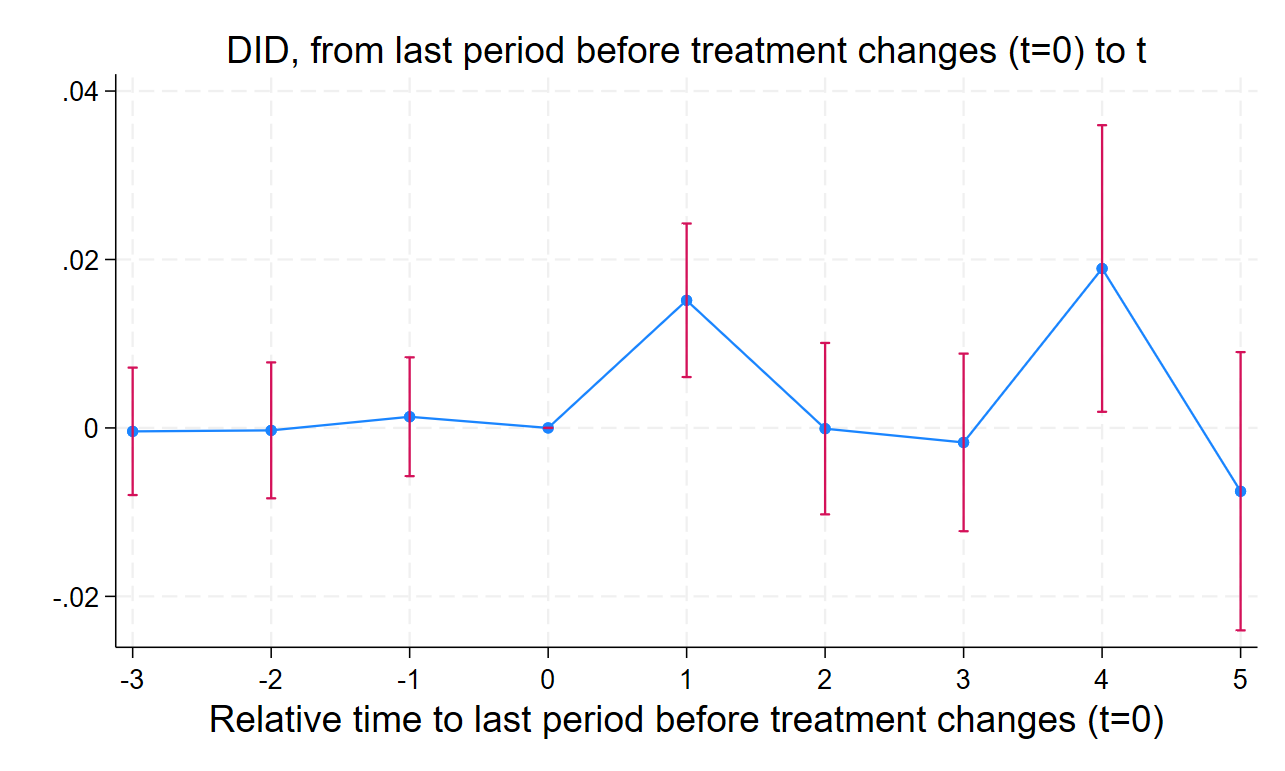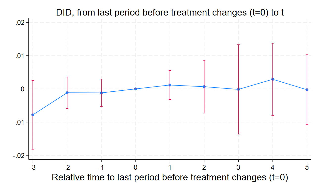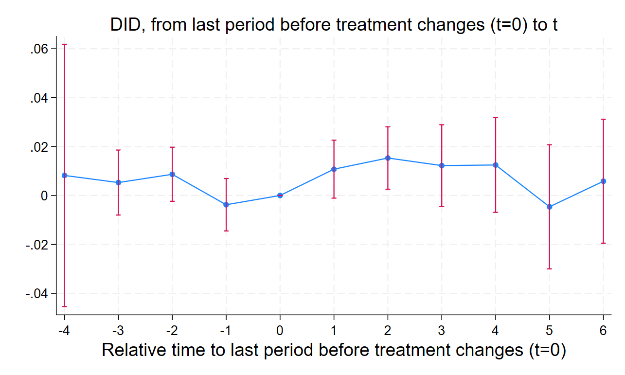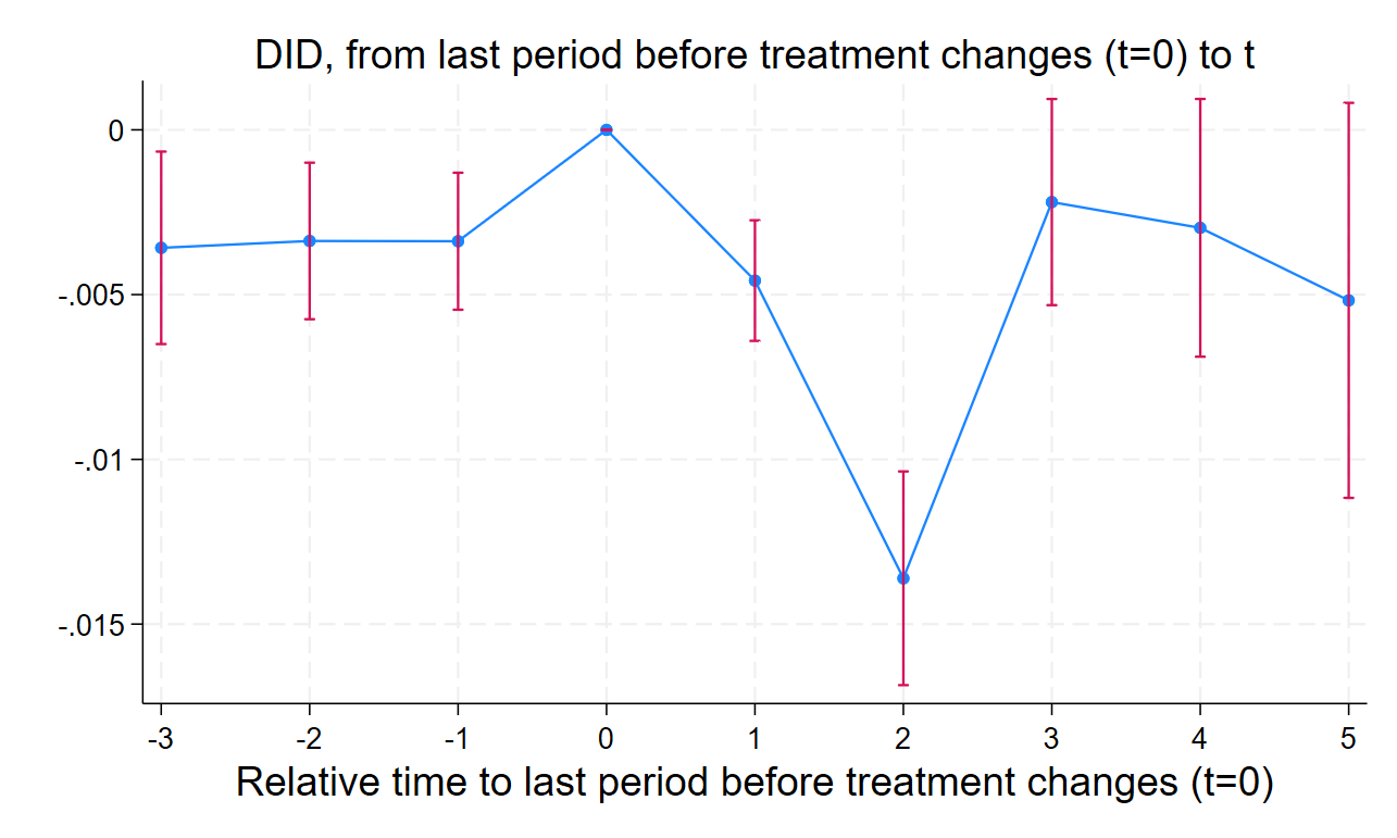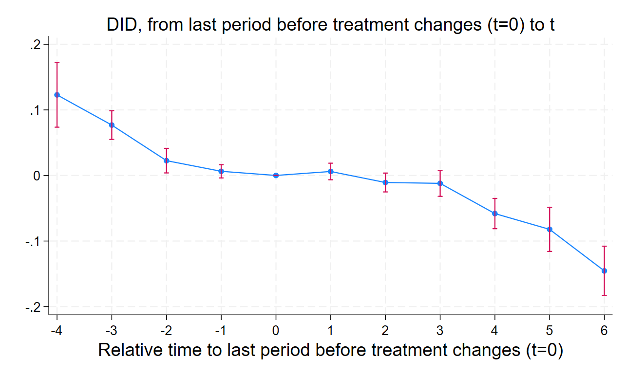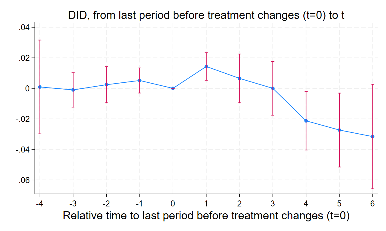 To check for bias, we also estimate the dynamic estimator developed by de Chaisemartin and D’Haultfoeuille.[24] This approach estimates the average effect of treatment at each relative time period before and after adoption and allows us to plot an event-study figure. We will use these dynamic estimates to examine whether treated and not-yet-treated institutions were on similar trends in the years leading up to adoption. We will test the parallel trends assumption by visually inspecting the event-study figures and reporting p-values on joint tests of nullity of the placebos. If our model suffers from widespread violation of the parallel trends assumption, we will create a matched pairs sample based on observed characteristics of institutions in the control and treatment groups and re-run the TWFE model.